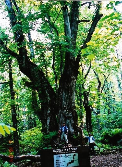 ここから原生林に踏み込む細道に入り、名勝沼まで歩を伸ばし「ウイルソンカツラ」をカメラに収め、山頂は時間的に無理なので引き返すことにした。甑峠迄戻り、再び美林に入り存分に森林浴をしながら右に進むと、積み石塚の先にカメラに収めきれない、カツラにしては極めて珍しい一本立ちの巨樹が現れ、姿が釈迦牟尼に近づく為に天上界に登る結袈裟姿の山伏に似ている事から仏陀木カツラ(※)と記してあった。そのすぐ先には女甑の大カツラ別名{鬼子母神権現カツラ}が鎮座していた。
